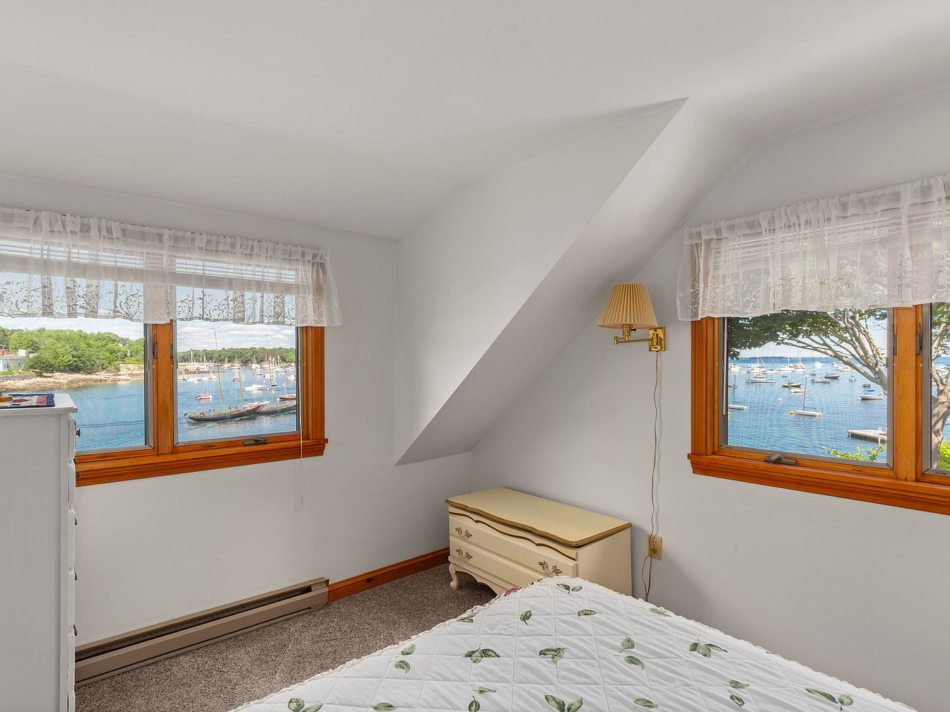 A cozy bedroom featuring a sloped ceiling and two large windows overlooking a picturesque harbor filled with boats. The walls are painted white, enhancing the spacious feel, while light-colored carpeting adds warmth. A vintage cream-colored dresser sits adjacent to the windows, complementing a decorative lamp mounted on the wall. Delicate lace curtains frame the windows, allowing natural light to illuminate the space. The bedding features soft greens with leaf patterns, adding a touch of nature. This serene space blends modern comfort with timeless elegance, showcasing stunning views of the tranquil waterfront.
