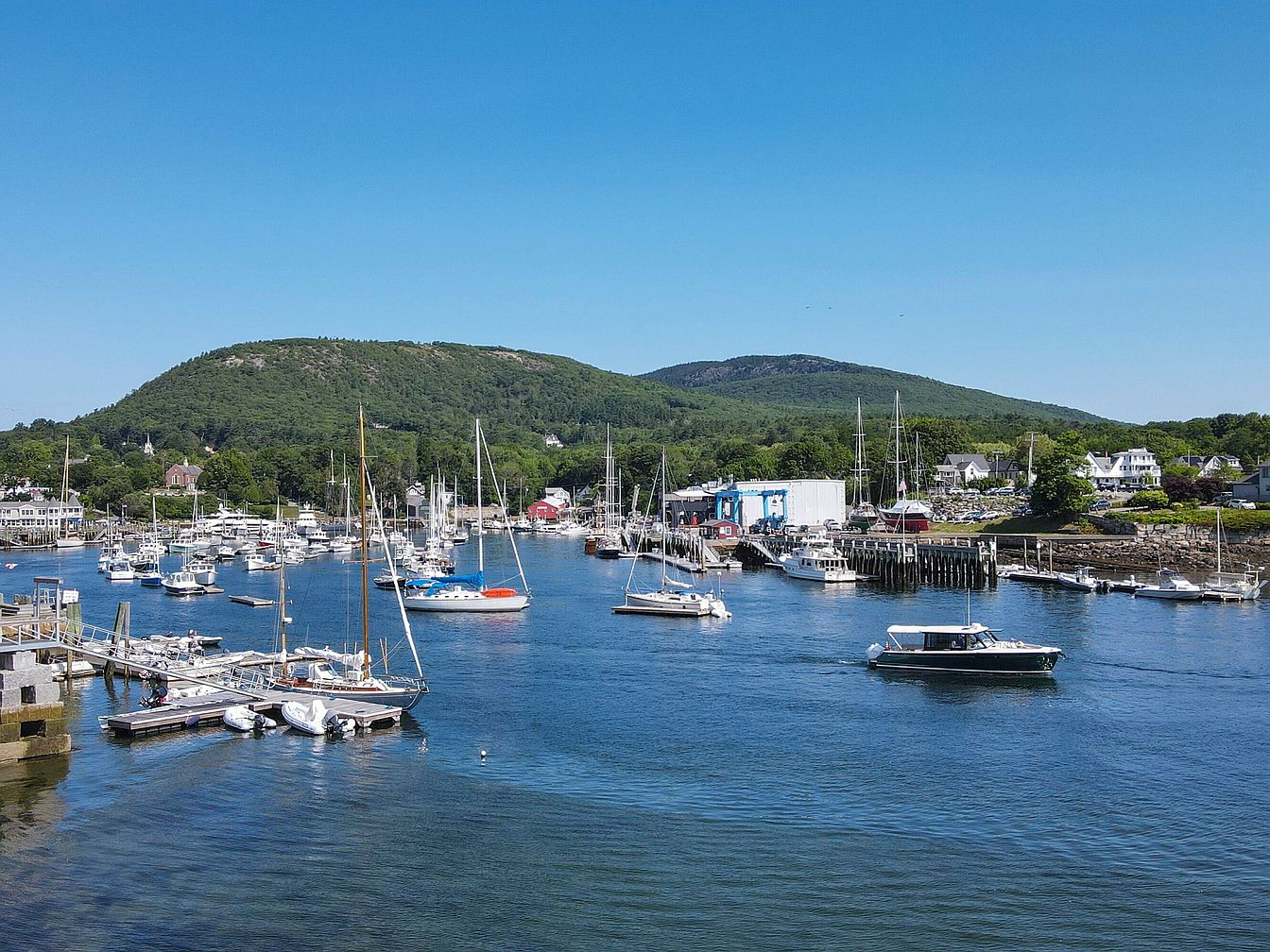 A picturesque coastal view showcasing a lively harbor filled with sailboats gently bobbing in the water. The scene features quaint buildings lining the shoreline, characterized by a mix of traditional New England architecture and vibrant colors. A backdrop of lush green hills enhances the tranquility, contrasting with the clear blue sky overhead. The marina area is bustling with activity, evidenced by the docks and boat slips. A few larger commercial buildings add a modern touch to the landscape. Trees and manicured gardens frame the scene, creating a harmonious blend of nature and seafaring lifestyle.