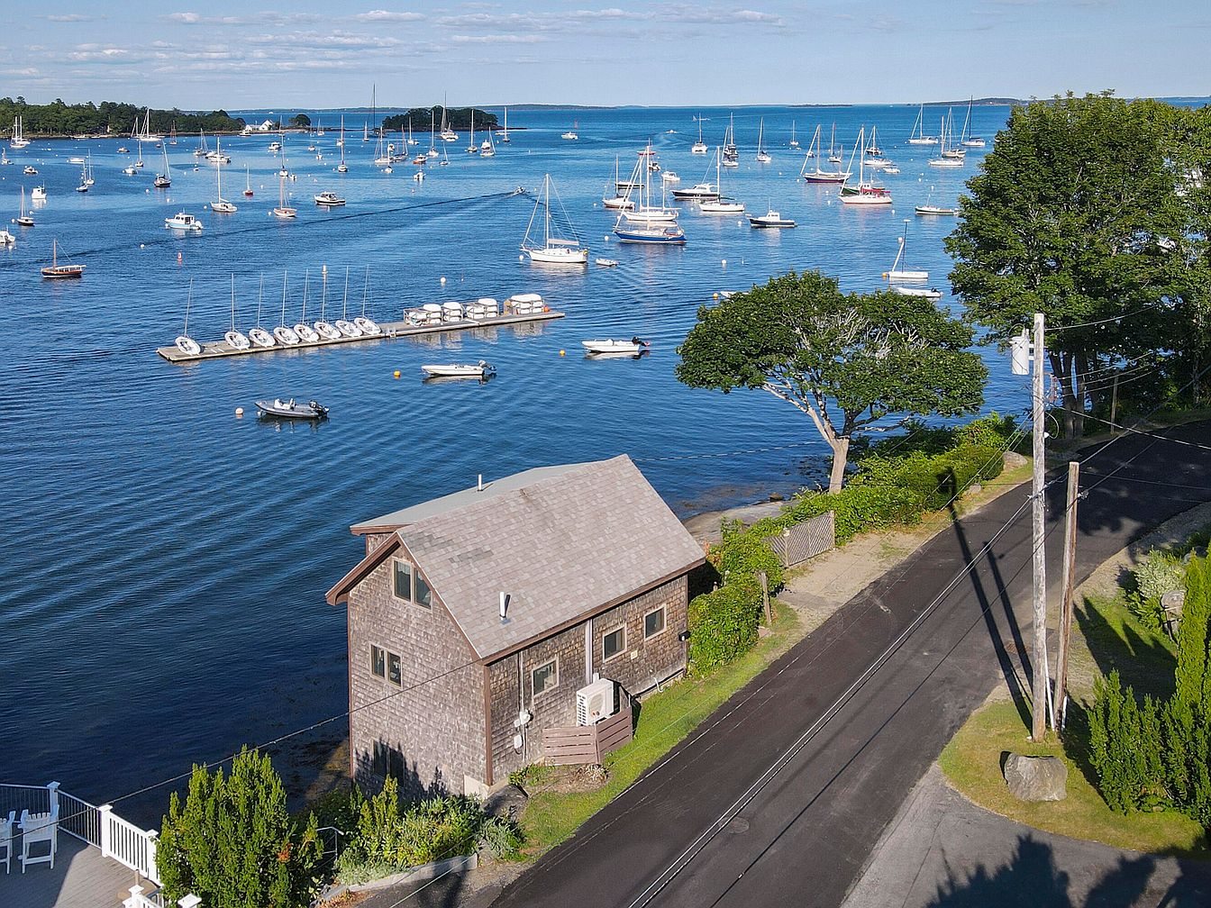 A charming coastal setting featuring a house with a rustic design, characterized by shingle siding and large windows. The structure has a steeply pitched roof, enhancing its historic appeal. Surrounding greenery adds a natural touch, framing the scene. In the foreground, a wooden fence blends with the vibrant landscape, while a narrow pathway leads to a vibrant marina filled with boats of various sizes, anchored in calm waters. The backdrop showcases hills under a bright blue sky, further enhancing the serene atmosphere of this seaside property, inviting tranquility and picturesque views.