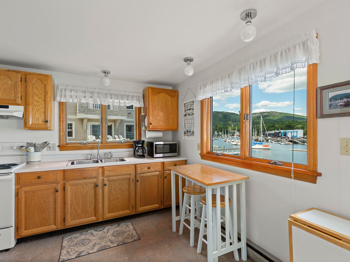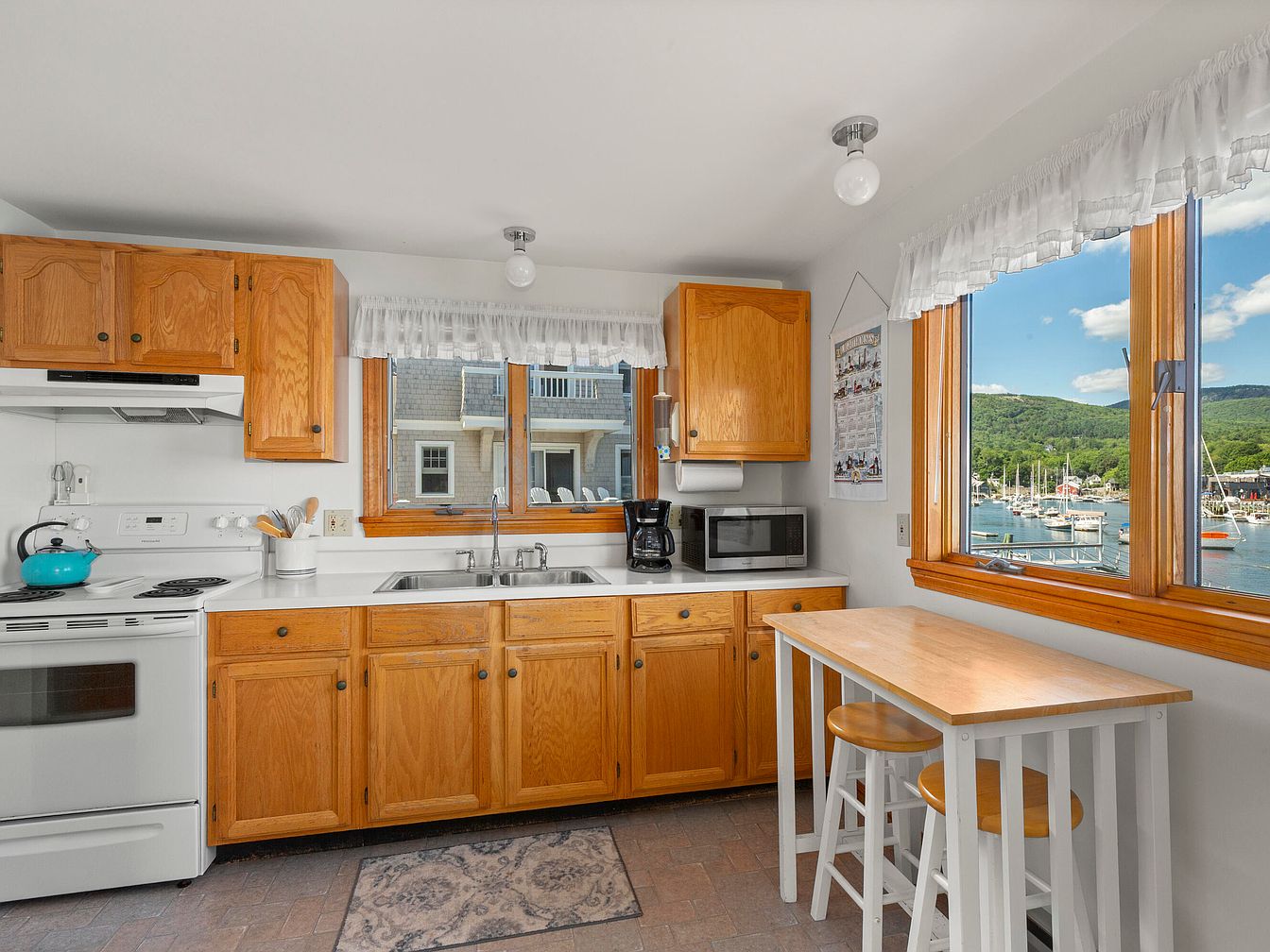 This cozy kitchen features oak cabinets and a white countertop, creating a warm, inviting atmosphere. Natural light floods the space through large windows, offering a scenic view of a harbor with moored boats and rolling hills. A simple island with two wooden stools stands in the corner, encouraging casual dining or conversation. The white walls and light-colored flooring enhance brightness, while decorative curtains add a touch of charm. Modern appliances, including a stove and microwave, blend seamlessly with the vintage-inspired elements, making it both practical and aesthetically pleasing. The overall feel is comfortable and homey.