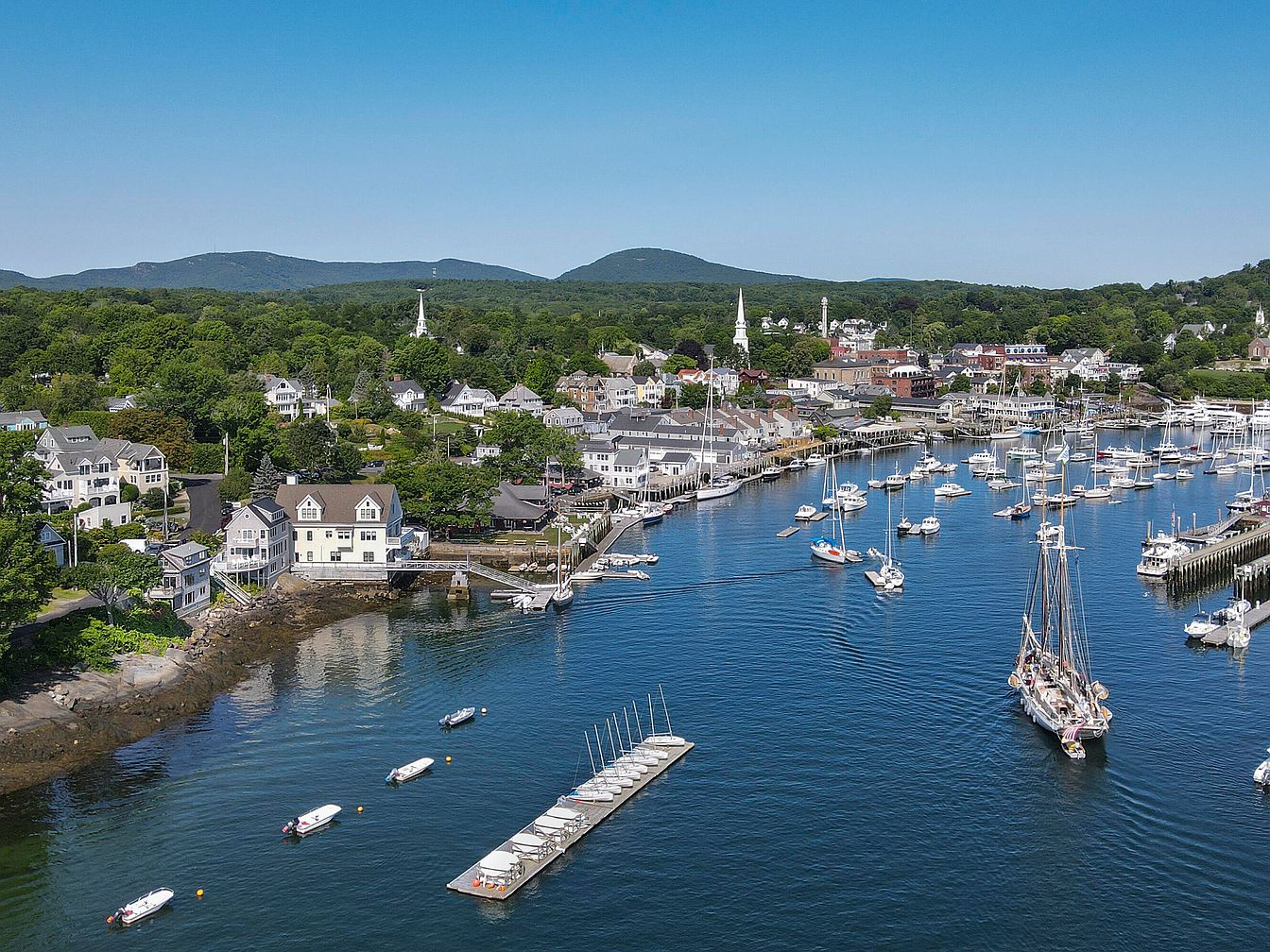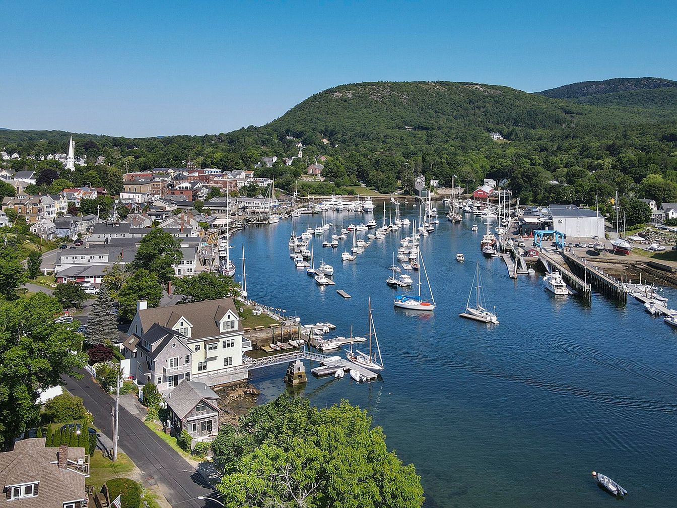 An aerial perspective of a charming coastal town, showcasing a bustling harbor surrounded by lush greenery and serene hills. Numerous boats are anchored in the clear, blue water, complemented by a long dock extending into the harbor. The town features an assortment of architectural styles, with pastel-colored homes and a prominent church steeple adding character to the landscape. The buildings are nestled against the hillside, framed by dense trees, creating a picturesque setting. A clear, vibrant sky enhances the inviting atmosphere, reflecting the tranquil and cheerful vibe of this waterfront community.
