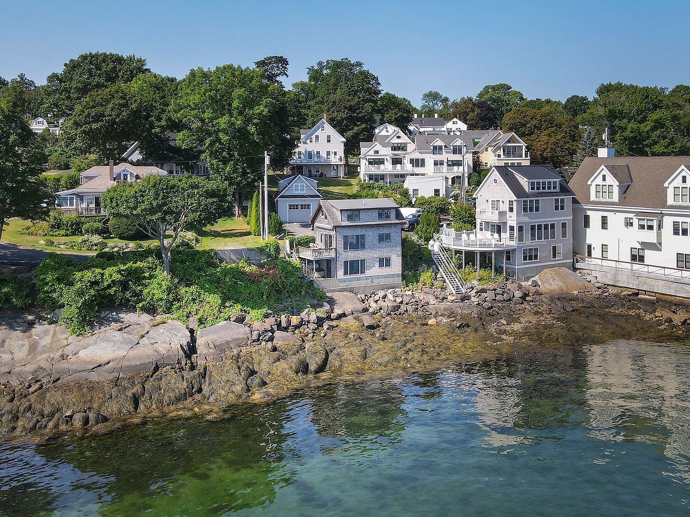 A panoramic view of several coastal homes nestled along a rocky shore showcases a blend of architectural styles. The foreground features a charming house with a wraparound deck and large windows reflecting the surrounding greenery. Light-colored exteriors contrast beautifully with dark roofs, while stone foundations add texture. Lush trees provide shade, enhancing the serene atmosphere. Further back, a mix of traditional and modern homes is visible, adding to the visual interest. The tranquil water glimmers under the sun, merging seamlessly with the lush landscape—creating a picturesque coastal scene that exudes charm and relaxation.