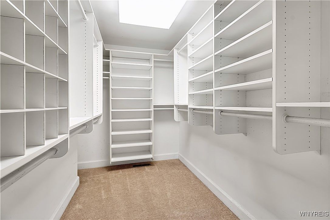 Spacious walk-in closet featuring built-in shelves, cubbies, and hanging rods on both sides, offering ample storage for clothing, shoes, and accessories. The neutral palette consists of clean white shelving contrasted by soft beige carpeting, creating a bright and inviting atmosphere. A large rectangular skylight above fills the closet with natural light, making it easy to see and organize belongings. Ideal for families, the abundance of compartments and open shelving allows for neat storage for adults and children alike, promoting organization and efficient use of space. The layout ensures easy access to every item while maintaining a tidy, clutter-free environment.