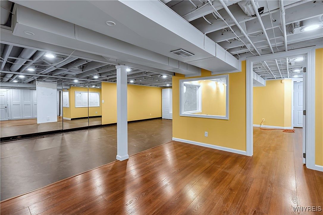 This newly renovated basement features an open layout with warm yellow walls and crisp white trim, providing a cheerful, inviting atmosphere. The ceiling exposes modern gray pipes and beams, contributing a contemporary industrial touch while maintaining ample headroom. One section of the floor is covered in glossy wood laminate, ideal for play or lounging, while another has a smooth brown surface suitable for recreation or workouts. A large mirrored wall enhances the spaciousness and is perfect for dance, yoga, or indoor games. Built-in recessed lighting brightens the area, creating a safe, versatile space for family gatherings and children’s activities.