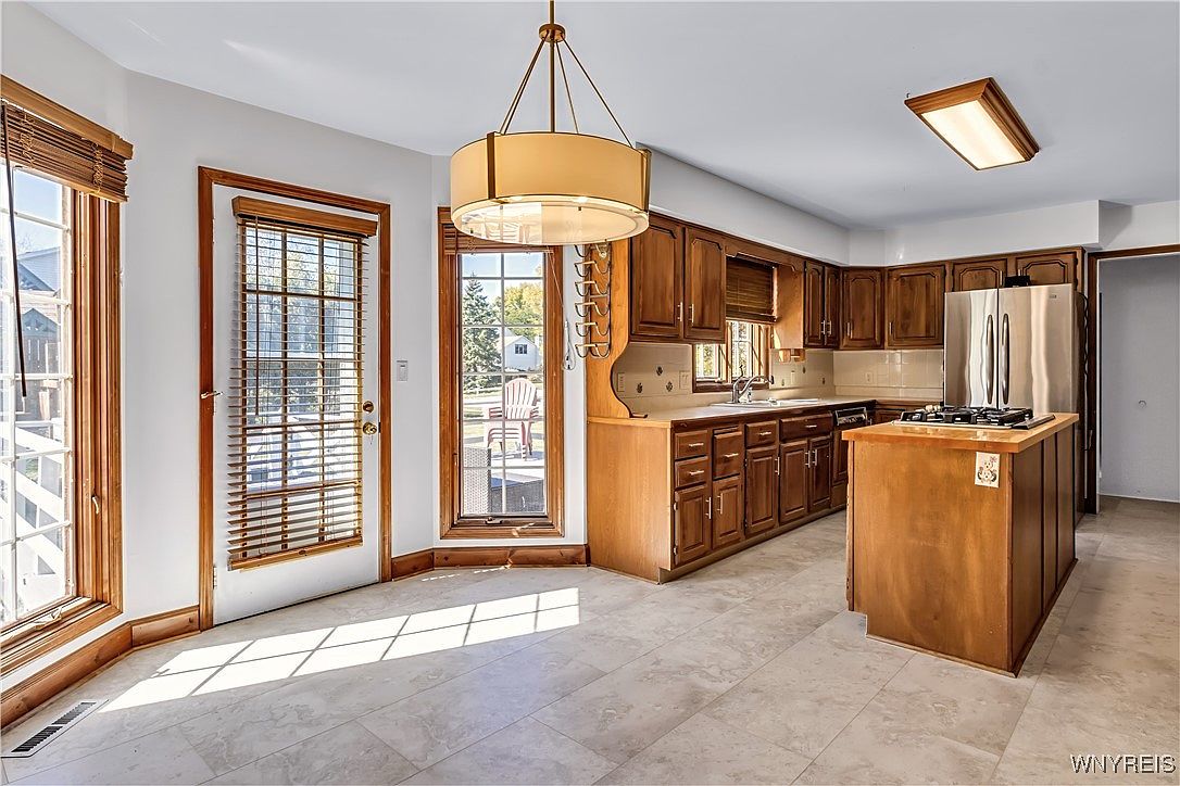 This bright, spacious kitchen features classic wooden cabinetry with plenty of storage space and a functional island with a built-in cooktop, making it ideal for meal prep and family gatherings. Large windows and a glass-paneled door bring in ample natural light, accentuated by warm honey-toned wood trim and elegant marble-look flooring. The family-friendly layout includes a breakfast nook under a modern circular pendant light, perfect for casual family meals. Stainless steel appliances, including a double-door refrigerator, enhance the contemporary feel, while expansive counters and a deep sink create a welcoming, practical atmosphere for cooking and spending time together.