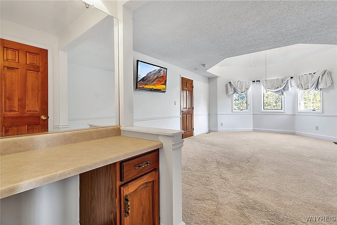 Spacious bedroom suite features soft, neutral carpeting and crisp white walls paired with elegant white trim and chair rails, creating a bright and airy atmosphere. Three large windows let in plenty of natural light, accentuated by decorative white valances that add a touch of charm while keeping the space family friendly. A mounted TV provides entertainment, while two polished wooden doors offer entry to adjacent areas, ensuring privacy and convenience. The room includes a built-in vanity with a wide mirror and warm wood cabinetry, perfect for daily routines. Open floor space allows flexibility for multiple furniture arrangements and play areas, ideal for family living.