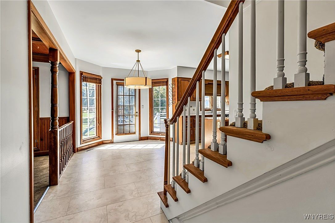 Warm and inviting entryway filled with natural light from three tall windows with wooden blinds, complemented by a modern pendant chandelier. The pale tile flooring extends throughout the space, creating a clean and open feel that is easy to maintain, ideal for busy family life. The oak staircase features white spindles and natural wood treads, leading up to the second floor. Adjacent wooden detailing, including columns and trim, adds a classic character. The view extends into the kitchen area, showcasing continuity of space and easy flow for daily routines. The layout allows for ease of movement and supervision, perfect for families.