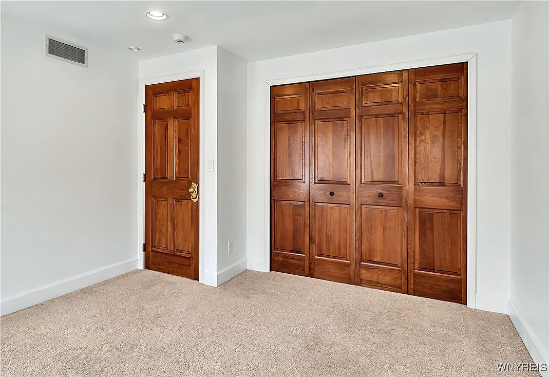 A spacious, bright bedroom corner features a set of four-paneled wooden closet doors and a matching main door, both finished in rich, warm brown tones that create a cozy, inviting atmosphere ideal for families. The room has plush beige carpeting, providing a soft, comfortable surface for children to play or relax. White trim and soft white walls enhance the sense of openness and allow for easy personalization. Recessed ceiling lights offer even illumination, while the sturdy doors and ample closet space make storage and organization convenient for growing families. The clean, uncluttered look ensures versatility for any décor style.