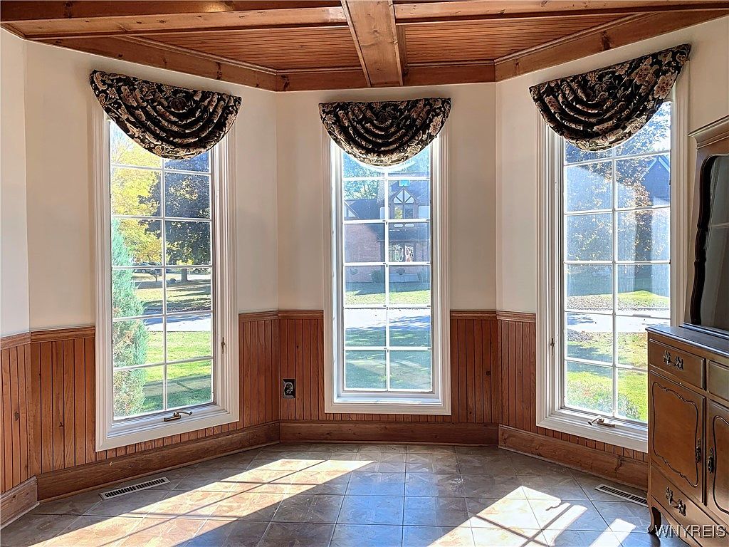 A bright bay window nook featuring three tall, white-trimmed windows that invite abundant natural light into the room. The windows are adorned with elegant, dark floral valances which add a touch of sophistication. Warm wooden wainscoting runs along the lower half of the cream-colored walls, complementing the matching coffered wood ceiling overhead. Tile flooring provides a durable and easy-to-clean surface, ideal for family life. This cozy corner is perfect for a reading area, play space, or breakfast spot, offering both charm and functionality. The open view of the neighborhood enhances the inviting, family-friendly atmosphere.