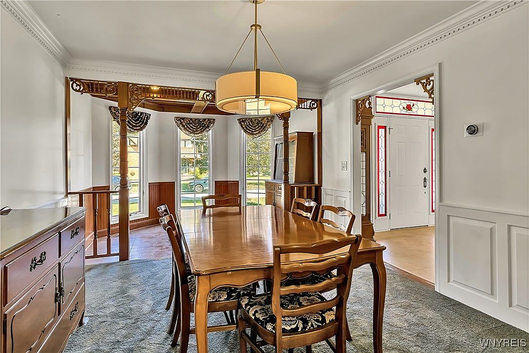 A spacious, family-friendly dining room features a long wooden dining table with matching chairs arranged for group meals. The walls are painted soft white with classic wainscoting and intricate crown molding for a touch of traditional elegance. Plush, neutral carpeting creates a cozy atmosphere, and a large, modern pendant light fixture hangs above the table. Large three-panel windows along one wall bring in abundant natural light, highlighted by decorative valances. Wood accents, including carved columns and cabinetry, add warmth to the room. The space opens to the bright front entrance, making it convenient for family gatherings and entertaining guests.
