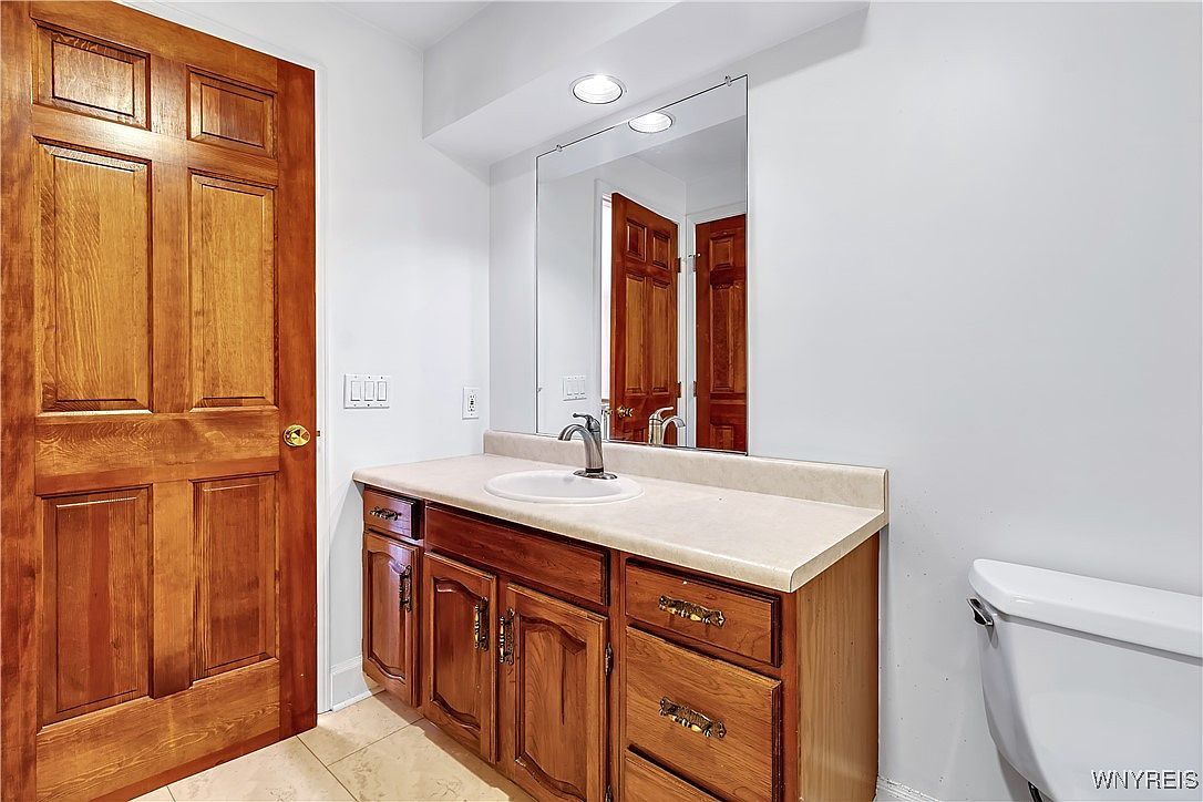 A well-lit bathroom features a spacious vanity area with natural wood cabinetry and polished brass handles, providing ample storage for family essentials. The countertop is a seamless, neutral-toned surface surrounding an inset sink with a sleek, dark faucet, creating a clean and practical workspace. The large, wall-mounted mirror brings in added brightness and visually enlarges the space, while the overhead recessed lighting ensures full illumination. The warm wood tones of both the vanity and doors contrast softly with the crisp white walls, producing a welcoming and timeless aesthetic perfect for daily family routines. The tile flooring offers easy maintenance and durability.