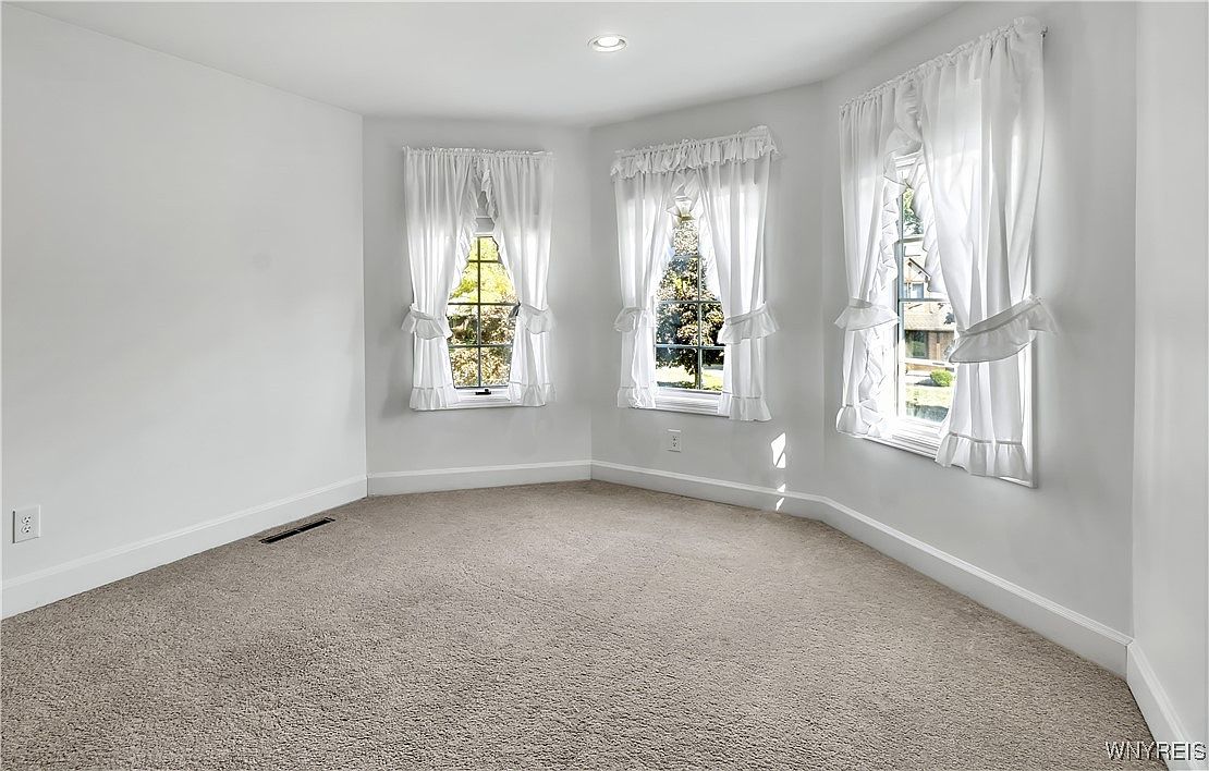 A bright and inviting bay window nook filled with natural light from three large windows dressed in soft, white ruffled curtains. The space features plush, light beige carpeting and smooth white walls, creating a clean and calming atmosphere ideal for families. This cozy corner provides ample room for children to play or for a quiet reading area, while the surrounding windows offer pleasant views of the neighborhood and plenty of daylight. The crisp baseboards add a finished touch, making it a versatile spot that would suit a playroom, homework station, or a relaxing family retreat.