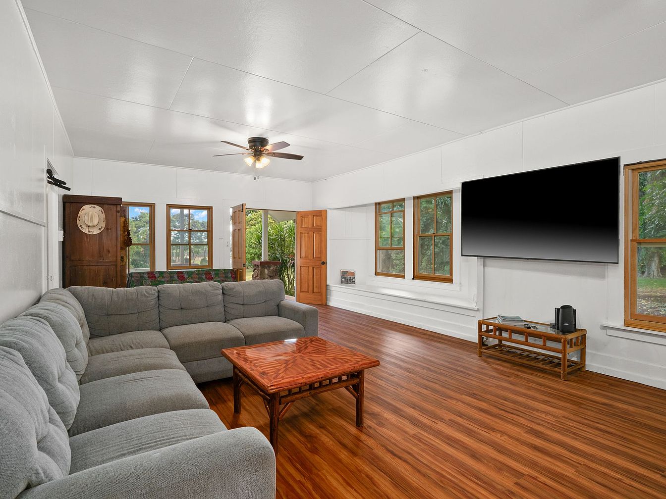 A spacious living room with wide-planked, warm-toned hardwood floors and crisp white paneled walls creates a bright, airy atmosphere. A large, plush sectional sofa in muted gray rests in the corner, surrounding a polished wooden coffee table with subtle carved details. Tall wood-framed windows and an inviting, partially open wooden door fill the room with natural light and lush green views. A ceiling fan with a central light fixture provides a vintage touch, complemented by a wall-mounted flat screen TV and a minimalist wooden media table. The overall look balances traditional structure with simple, welcoming comfort.