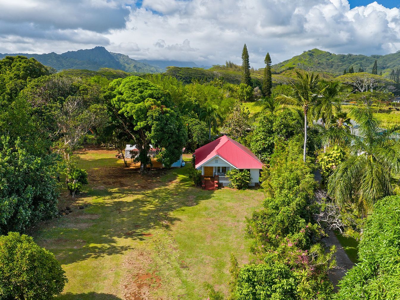 A single-story historic house with a bright red roof and white exterior walls is centered in a lush, expansive front yard. The large grassy lawn stretches toward the home, bordered by mature tropical trees and plants with dense green foliage. The house features a small front porch with wooden steps and is flanked by foundation plantings. Surrounding the property are vibrant trees, including palms and flowering bushes, providing shade and privacy. In the background, dramatic green mountains rise under a partly cloudy sky, enhancing the scenic and tranquil setting. The overall aesthetic combines rustic charm with natural Hawaiian beauty.