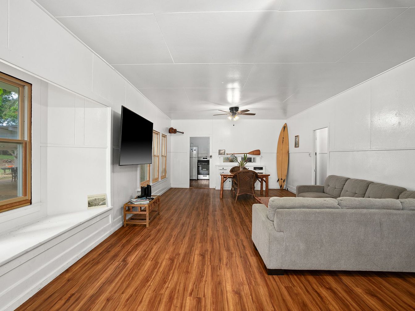 A spacious living room stretches lengthwise with a mid-century modern feel. Warm, wood-toned floors extend throughout, contrasting with crisp white paneled walls and a white ceiling. A large sectional gray sofa sits on the right, opposite a flat-screen TV mounted on the wall. The room features multiple large windows with natural wood trim, letting in ample daylight. At the far end, an open dining area holds a wooden table and rattan chairs, with a classic surfboard and oar accenting the back wall. The kitchen is partially visible beyond, while a ceiling fan with a light fixture centers the space, creating a casual, inviting atmosphere.