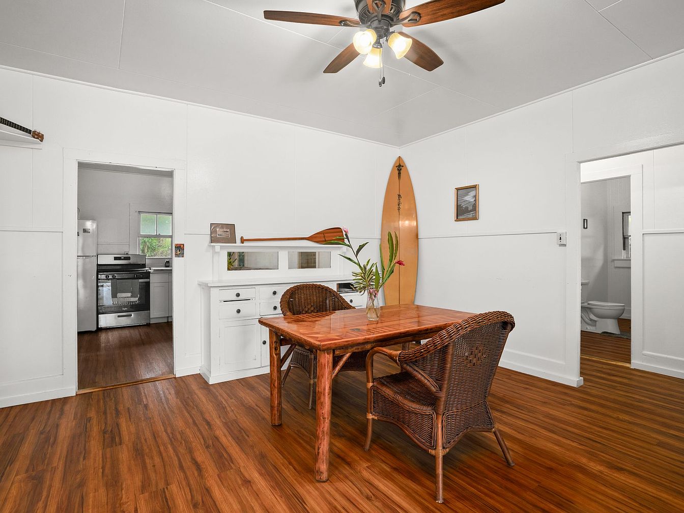 A cozy and inviting dining room displays warm, amber-toned wooden floors and crisp white walls, creating a clean, airy aesthetic. The space features a wooden dining table with a wicker chair placed on one side, topped with a small vase of tropical flowers for a pop of color. Above, a ceiling fan with wood blades provides both function and style. An old-fashioned sideboard sits against one wall, adorned with a decorative oar and nautical accents, while a long surfboard leans upright in one corner, enhancing the laid-back, beachy ambiance. Two doorways lead to the kitchen and bathroom beyond.