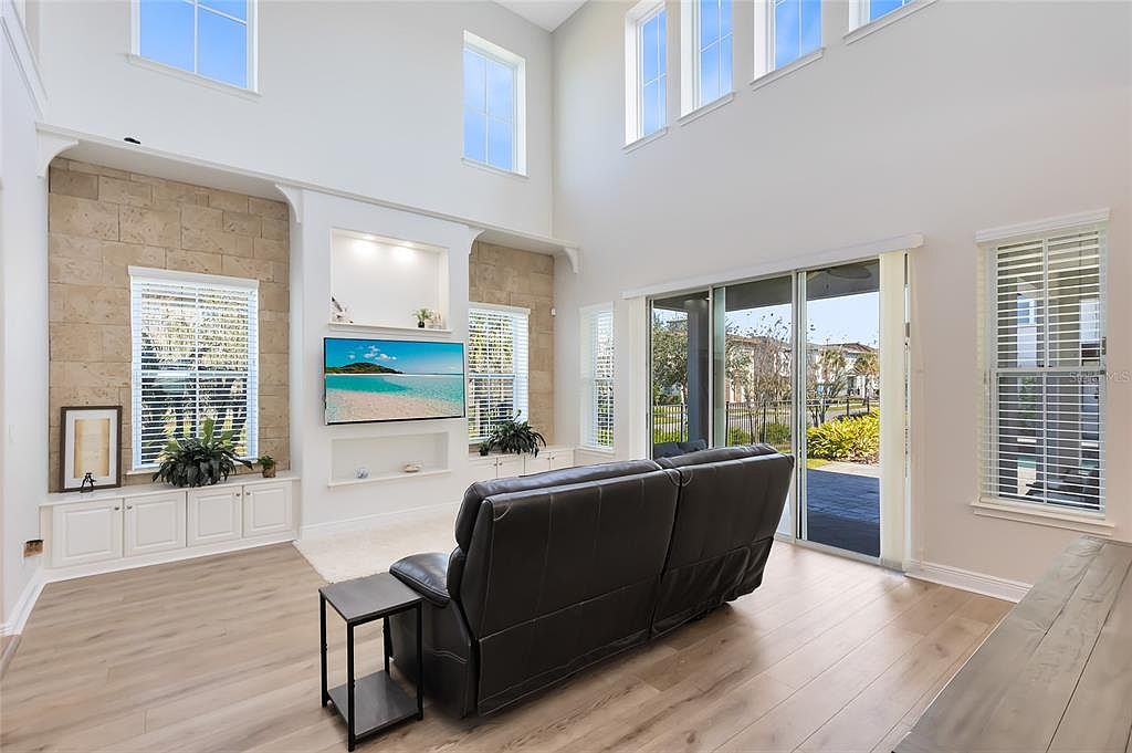The spacious living room features tall ceilings and a warm, neutral color palette. One wall is adorned with natural stone, creating a textured contrast with the smooth white walls. Large windows flood the room with natural light, enhancing the airy feel. A modern entertainment center holds a flat-screen TV, framed by built-in shelving that includes a subtle decorative plant. A sleek black leather sofa invites relaxation, paired with a minimalist side table. Light wood flooring adds warmth, while the open layout seamlessly connects to views of the outdoor space through sliding glass doors, blurring indoor-outdoor living.