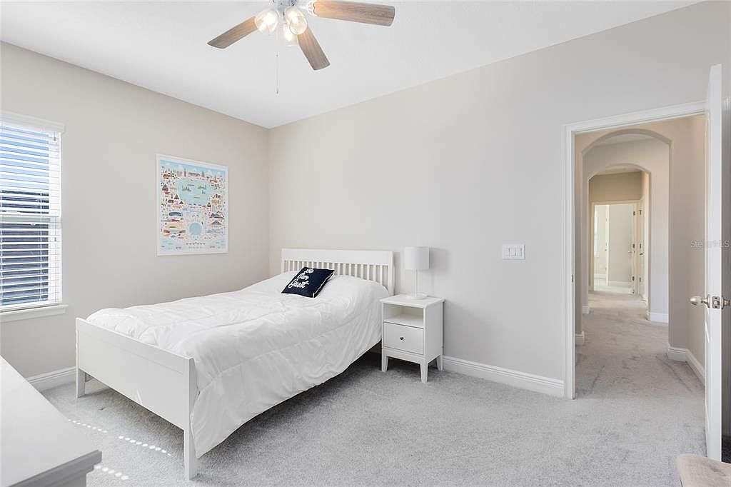 This cozy bedroom features a soft, neutral color palette set against light gray walls, enhancing the serene atmosphere. A white wooden bed with a plush white comforter dominates the room, offering comfort and simplicity. A small bedside table stands next to the bed, topped with a simple lamp. To the left, a window adorned with blinds allows natural light to fill the space, contributing to a bright ambiance. A colorful map artwork hangs on the wall, adding a touch of personality. The carpeted floor adds warmth, leading to an arched doorway that opens to a spacious hallway.