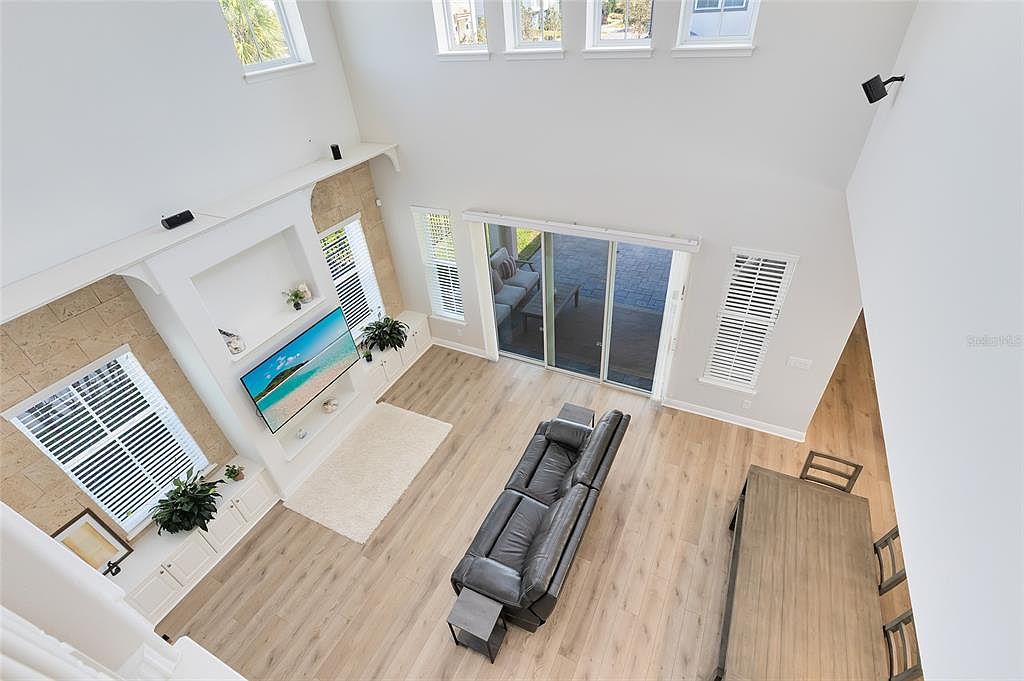 This spacious living room features an airy design with high ceilings, bathed in natural light from multiple windows. The neutral white walls and warm wooden flooring create an inviting atmosphere. A large, plush gray sectional sofa anchors the space, providing ample seating. Opposite the sofa, a mounted flat-screen TV rests on a minimalist wall unit that adds a modern touch. A sliding glass door leads to an outdoor patio, enhancing the room’s connection to nature. Decorative plants and subtle artwork add charm, while the overall layout suggests a perfect blend of style and comfort, ideal for relaxation and entertainment.