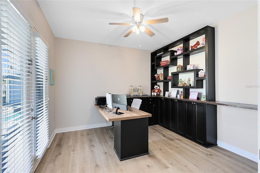 This home office features a clean, modern aesthetic with a warm color palette of soft beige walls and light wood flooring. A substantial, contemporary desk made of natural wood contrasts with the sleek black cabinetry, which includes shelves displaying decorative items. Natural light floods the space through large, white plantation shutters. The ceiling fan provides an element of comfort. Innovative design elements like the built-in storage seamlessly combine functionality with style. The layout is open, promoting a productive environment. The decor reflects personalization, with carefully arranged items adding a touch of charm to the workspace.