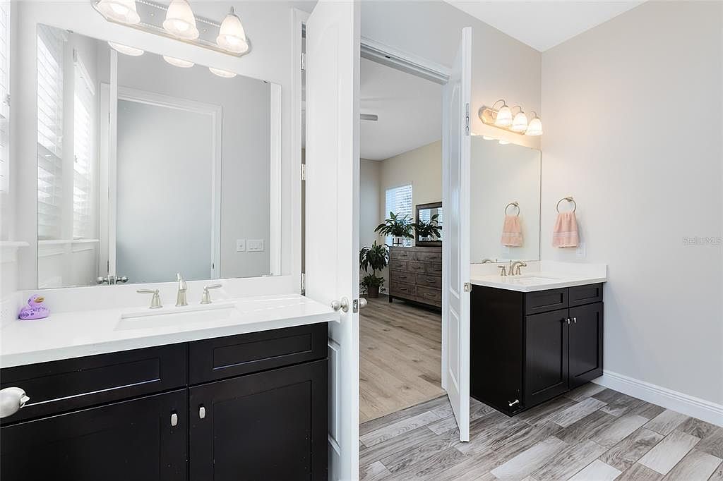 The image reveals a modern bathroom layout, featuring a dual-sink vanity with dark wood cabinetry and sleek, white quartz countertops. Above, a contemporary light fixture illuminates the space. The large, frameless mirror enhances the room’s openness. A subtle gray wall color complements the warm-toned floor tiles, which exhibit a mix of light and dark shades, adding depth. Leafy plants add a touch of nature in the background, while soft pink towels hang elegantly on the wall fixtures. A doorway leads to an adjacent room, enhancing the flow between spaces. The overall aesthetic is fresh and inviting.