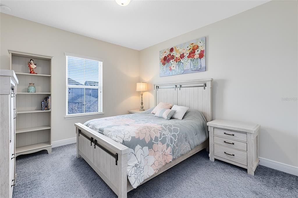 A serene bedroom space featuring a light color palette with soft beige walls and plush gray carpeting. A queen-sized bed with a floral comforter and multiple pillows creates a cozy focal point. Flanking the bed, two side tables in a matching light wood tone complement the headboard’s rustic charm. A decorative painting of flowers hangs above the bed, adding a splash of color. Natural light streams through a nearby window, illuminating a corner bookshelf adorned with books and a decorative figure. An elegant bedside lamp offers warm lighting, enhancing the inviting atmosphere of this tranquil retreat.