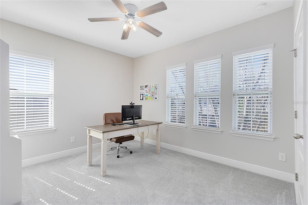 This cozy home office features a minimalist design with light gray walls that enhance the airy feel. Natural light floods the space through three white, shuttered windows, creating a warm, inviting atmosphere. A sleek, light wooden desk sits centrally, accompanied by a brown leather office chair. The soft, plush carpet underfoot adds comfort, while a ceiling fan with wooden blades ensures air circulation. Wall decor includes a bulletin board adorned with notes and images, giving it a personalized touch. The overall aesthetic combines functionality with a serene environment, perfect for productivity and focus.