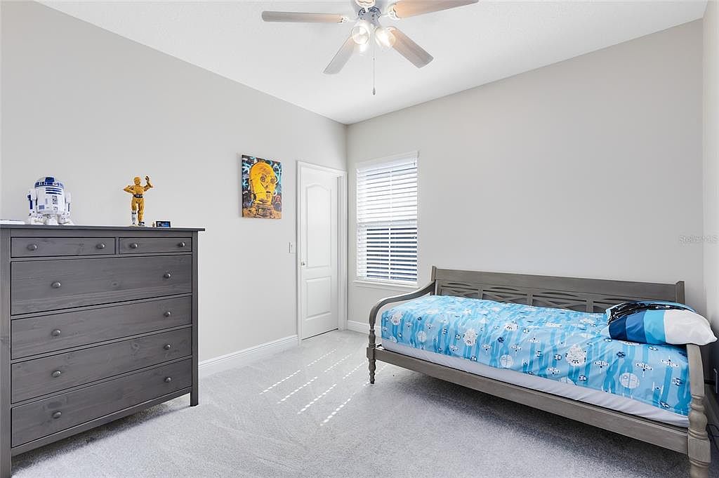 This child’s bedroom features light gray walls that create a calming backdrop. A sleek, dark gray dresser sits against one wall, adorned with playful figurines. The twin bed, with a fun blue and white polar bear-themed comforter, is positioned against another wall, emphasizing a cozy vibe. Natural light streams in through a nearby window, enhanced by horizontal blinds, casting soft shadows across the plush carpet. A colorful abstract art piece adds visual interest, while a fan overhead decorates the ceiling, ensuring a comfortable atmosphere. The room balances functionality with whimsical charm, making it an inviting personal space.