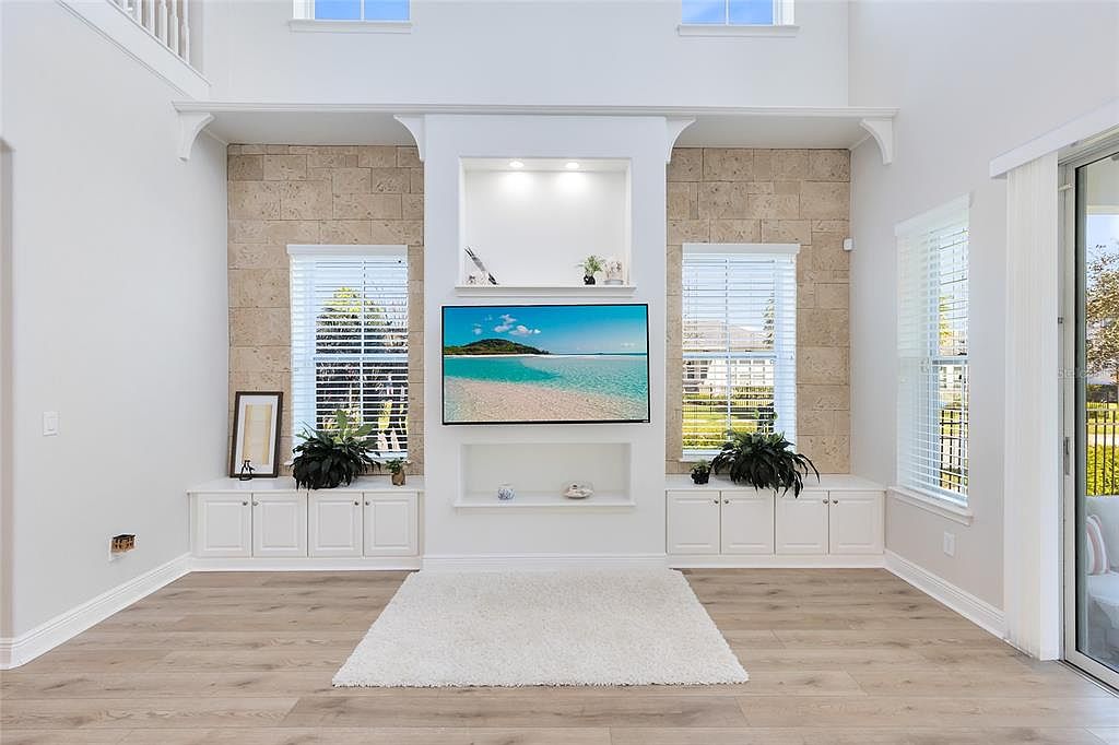 A spacious living room featuring a stunning focal point wall made of natural stone, contrasted by crisp white cabinetry and trim. Large windows fill the room with abundant natural light, highlighted by simple white blinds. A modern flat-screen television hangs centrally, showcasing a serene beach scene. The wooden flooring, in light tones, adds warmth and pairs well with the soft, plush area rug underneath. Potted plants add greenery and vitality, while built-in shelves provide space for decorative items. The overall color scheme is neutral, creating a calm and inviting atmosphere perfect for relaxation and gatherings.