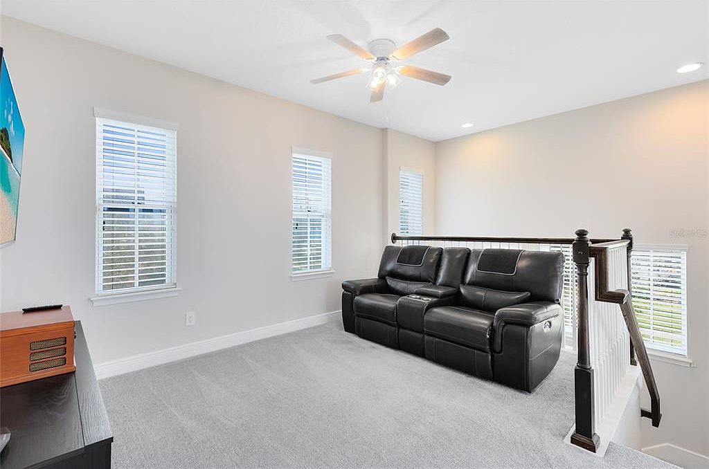 A cozy loft area showcases a minimalist design with soft beige walls and plush gray carpeting, contributing to a serene atmosphere. Two large windows allow natural light to flow in, framed by white shutters that add to the overall brightness. A sleek black reclining sofa offers comfortable seating, positioned for relaxation and conversation. Complementing the seating is a modern wood cabinet housing a vintage-inspired radio, adding a nostalgic touch. The ceiling fan above adds both style and function, while the open railing provides a visual connection to lower levels, enhancing the spacious feel of the area.