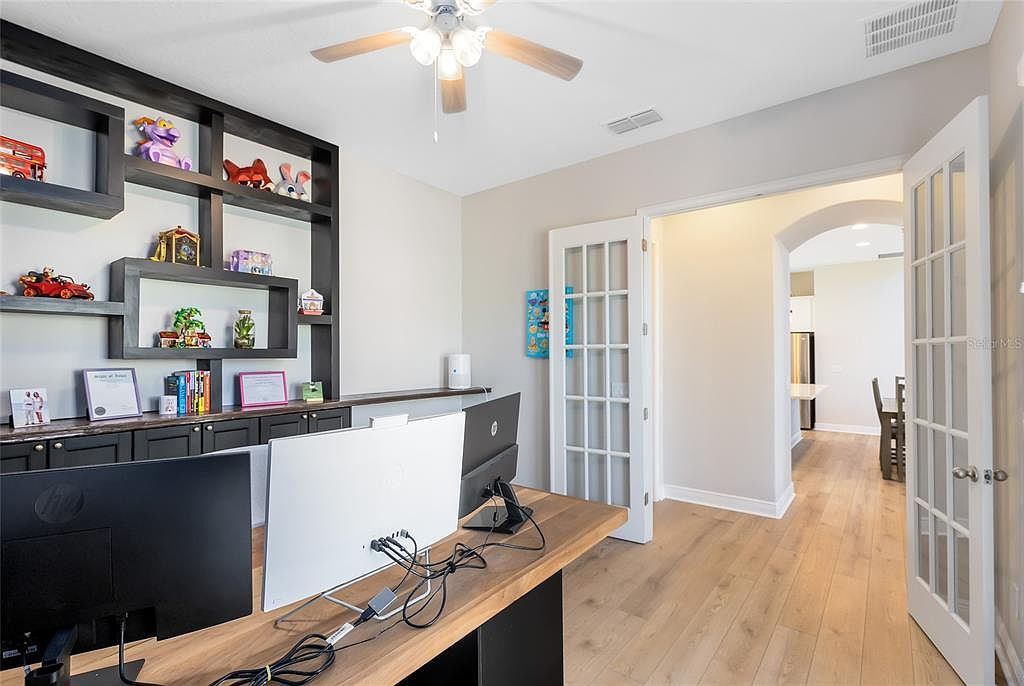 This home office features a minimalist design with warm wooden flooring that enhances the inviting atmosphere. The wall is adorned with a contemporary black shelving unit, displaying colorful toys and knickknacks, adding a playful touch. A spacious wooden desk houses dual computer monitors, supported by a sleek metal design. French doors frame the entrance to the room, leading to a softly lit hallway that opens to the kitchen area. The neutral beige walls provide a calming backdrop, complemented by the subtle ceiling fan, ensuring comfort. Overall, this office balances functionality with stylish decorative elements.